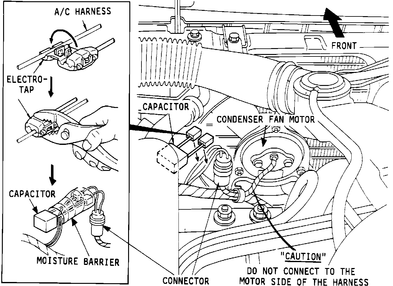 2. Using the Electro-Tap connectors provided with the capacitor, attach it in parallel to the A/C wiring harness fan leads. It is necessary to use pliers to compress the Electro-Tap connector until a "click" is heard to assure that a positive connection has been made.