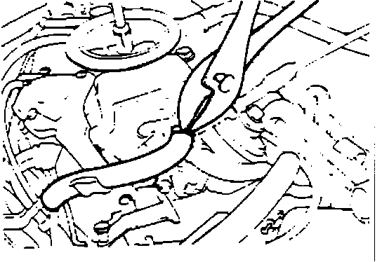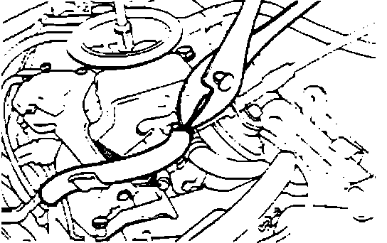 11. Remove the upper coolant hose from the carburetor choke wax element housing, and move it away from the carburetor carefully to prevent damaging the hose or spilling coolant.