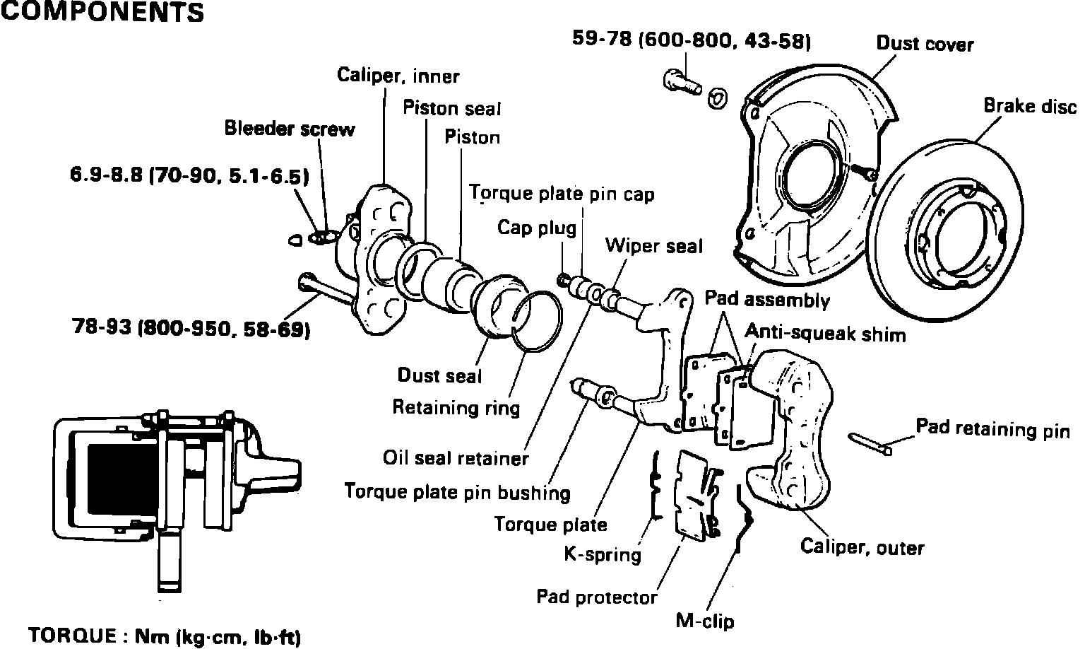 2. Inspect caliper bore, piston and torque plate for damage or excessive wear. Replace parts as necessary.