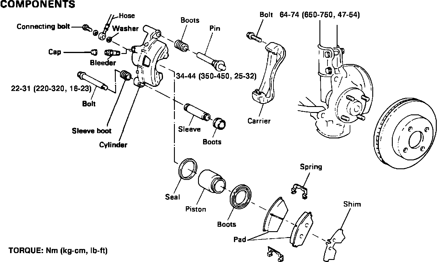 1. Install caliper assembly and attaching bolts on steering column. Torque caliper to steering knuckle attaching bolts to 43-58 ft. lbs.