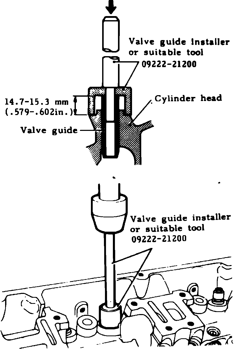 3. Press fit new valve guide into top of cylinder head using tool No. 09222-21200 or equivalent, Fig. 5. Tool No. 09222-21200 installs valve guide to a pre-determined height. If this tool is not available, ensure that distance between cylinder head and top of guide is .579-.602 inch, Fig. 5. If a standard size valve guide has been removed, the replacement guide should be oversized. Ensure that valve guides are installed at room temperature.