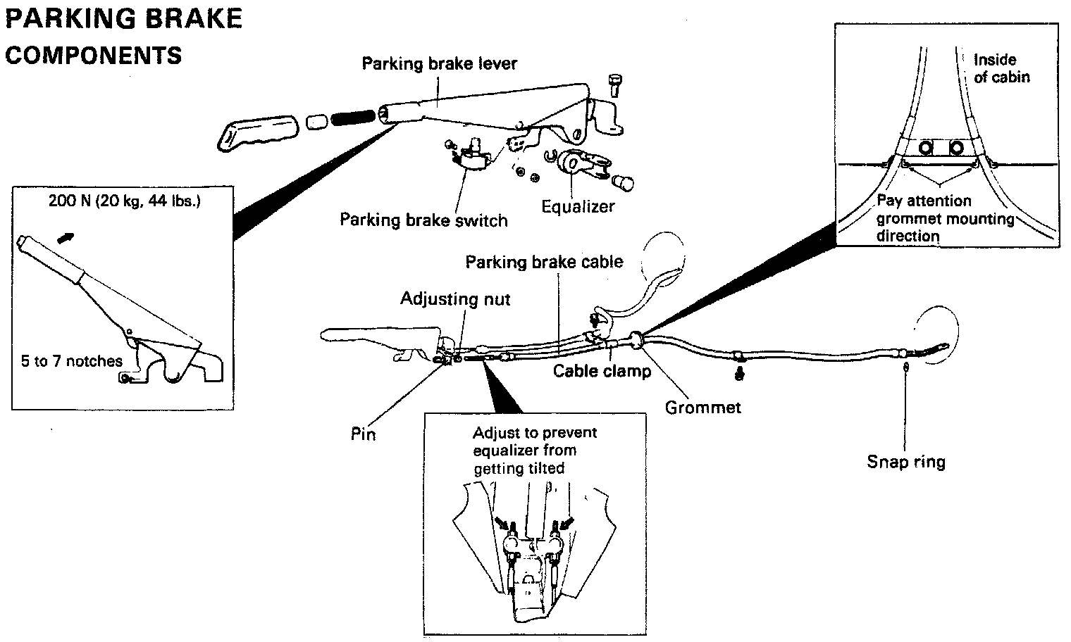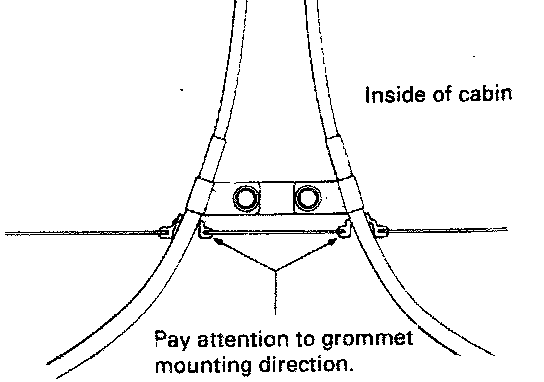 1. When the cable clamps are tightened, make sure that the brake cables are laid smoothly along the floor and cable protectors on the suspension arm.
