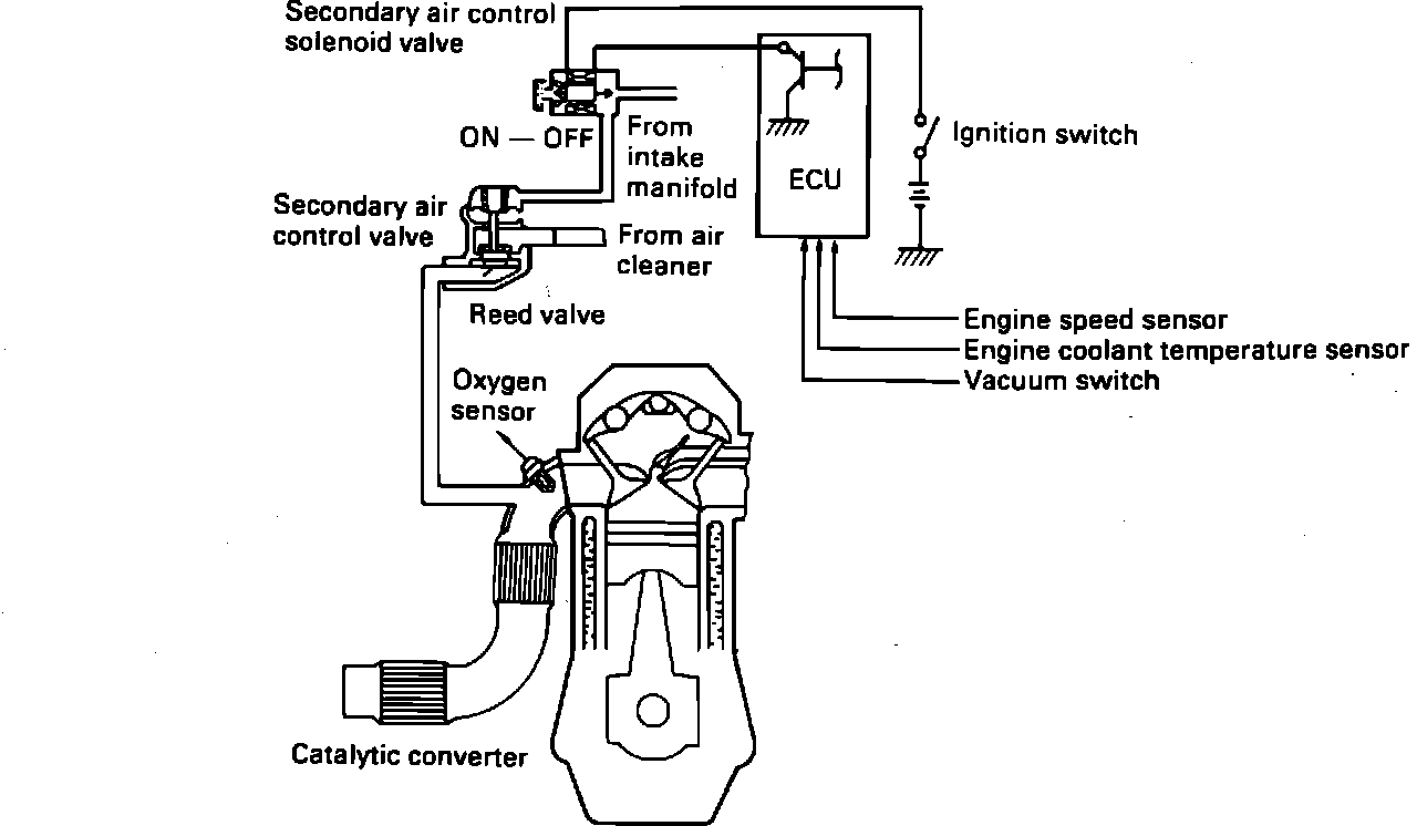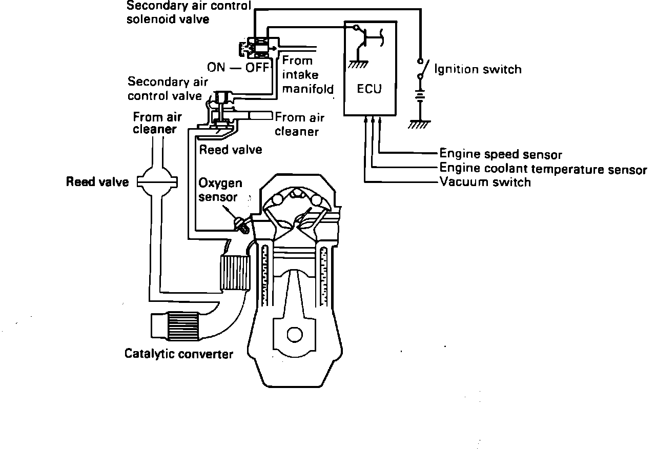 The ECU controls the Secondary Air Control Solenoid Valve in response to the inputs it receives from the engine speed sensor, engine coolant temperature sensor and the vacuum switch. For more detail on how this affects the operation of the pulse air system, refer to EMISSIONS.