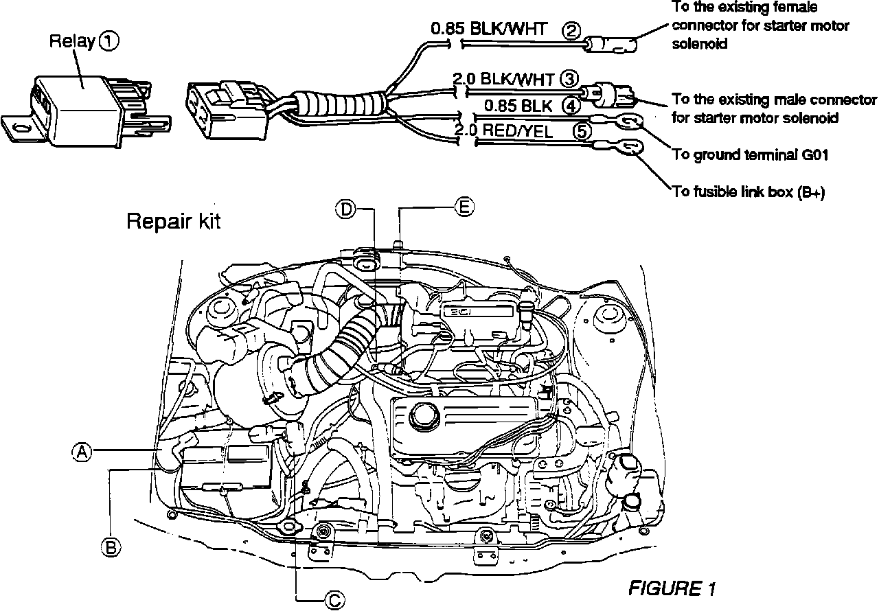 9. Disconnect the connector for the starter motor solenoid (C31 for Excel, C18 for Scoupe). (Refer to Figure 1, items D and E)