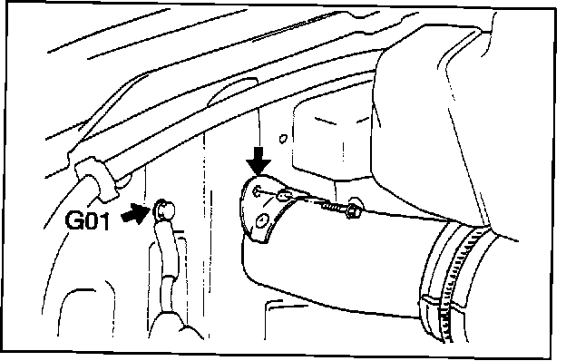 4. Remove the 10 mm mounting bolts for the air duct and the G01 ground cable. (Refer to Figure 1, items A and B)