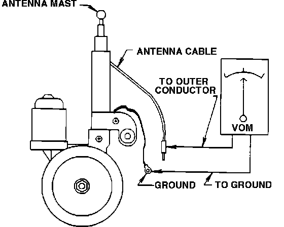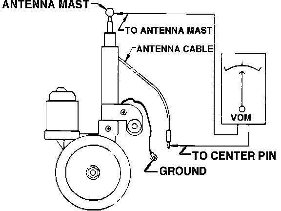 Using a Volt OHM Meter (VOM), check for continuity between the antenna mast and the center pin of the antenna cable. Continuity must be present. If there is no continuity, the antenna should be replaced.