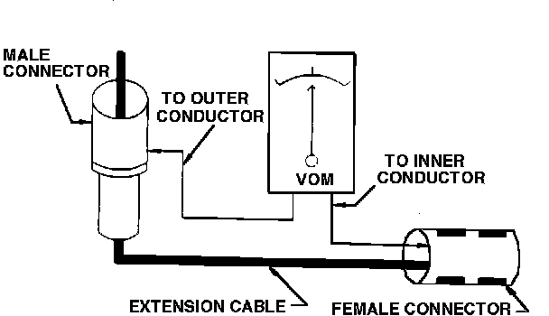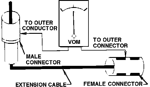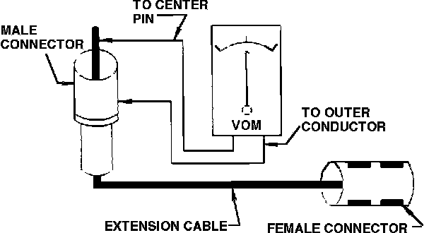 Using a VOM check for continuity between the extension cable center pin and outer conductor. Continuity must not be present. If there is continuity, the extension cable should be replaced.