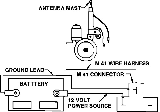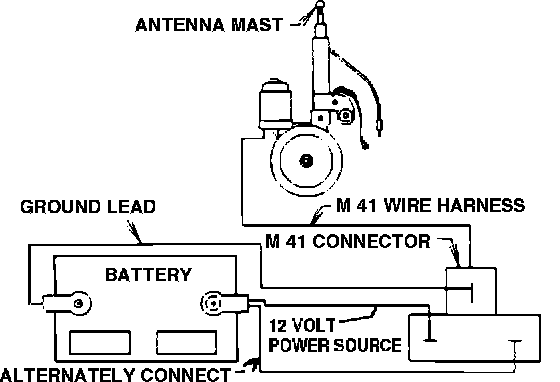Connect a ground lead to pin 1 and a 12 volt power source to pin 2 of the M41 (antenna motor) connector. The antenna mast should remain in or go to the stowed position.