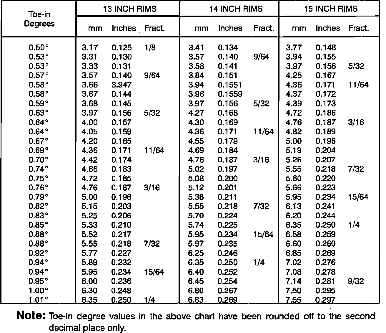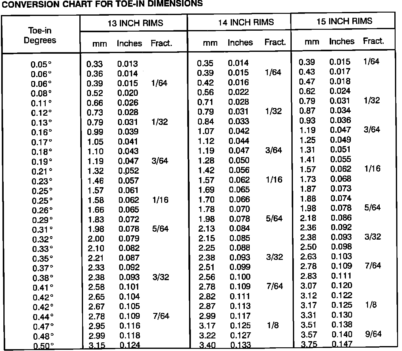 Toe-in and Camber measurements are usually indicated in angular degrees. Some alignment machines display figures for Toe-in in fractions of an inch, in decimal inches or in millimeters. The equivalent angular degrees can easily be obtained from the table.