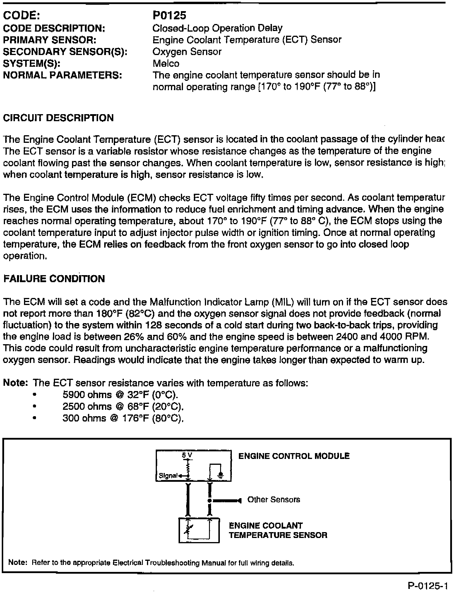 This TSB provides updated information for diagnostic code P0125 (Delayed closed loop operation). A P0125 code may be set by inaccurate readings from the Engine Coolant Temperature (ECT) sensor or may also be set by an oxygen sensor reading.