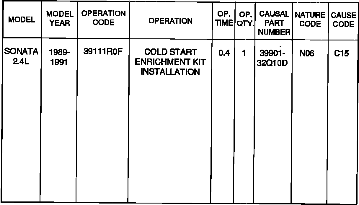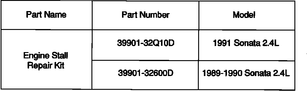 1989-1991 model year Sonatas with 2.4L engines and automatic transaxles may stall when the ambient air temperature is 50-70 degrees F and the transaxle is shifted into gear immediately after starting a cold engine. A cold start enrichment field fix kit has been designed to correct this condition. This kit does not affect engine performance at any other time.