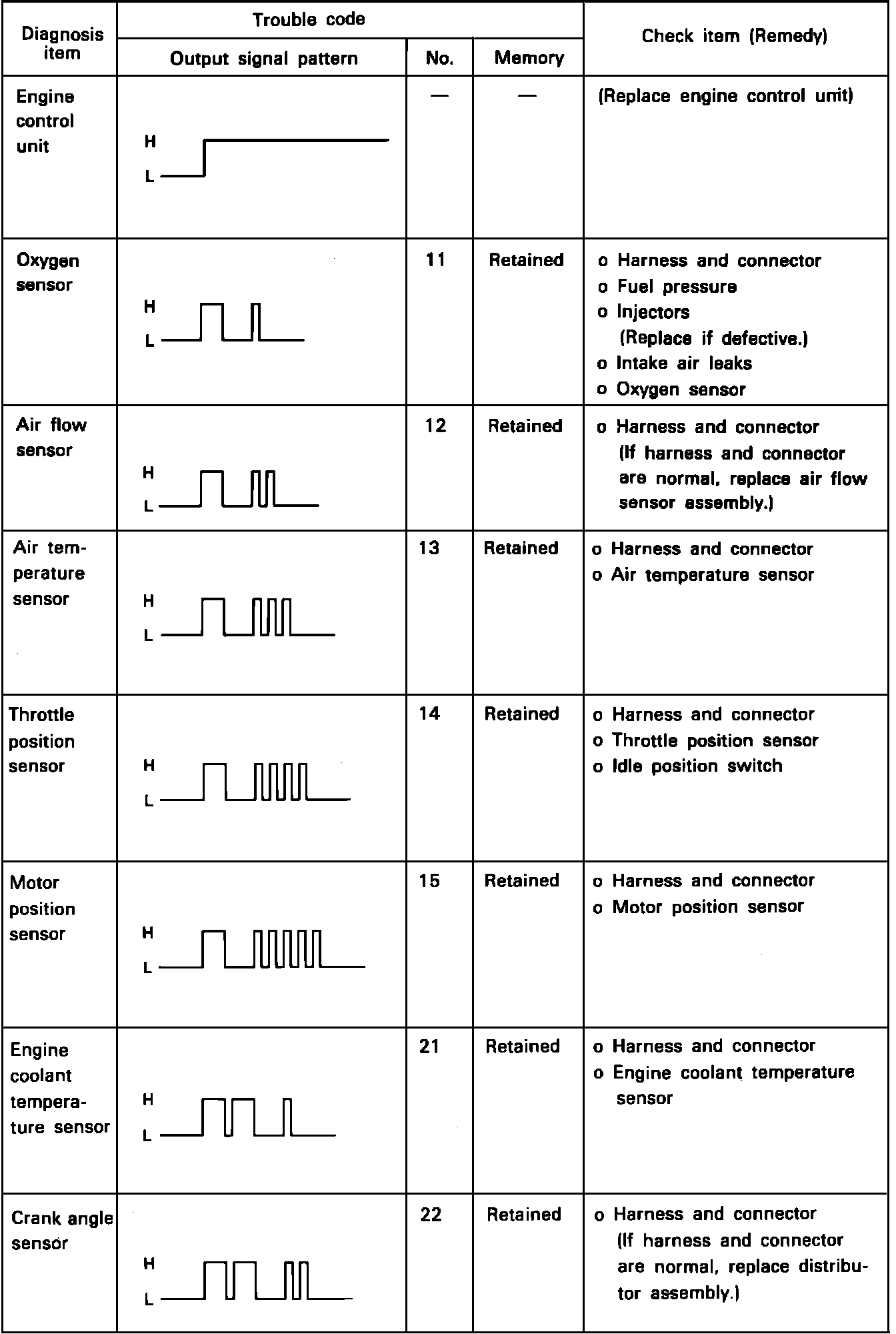 Diagnostic Trouble Codes 11 - 22: