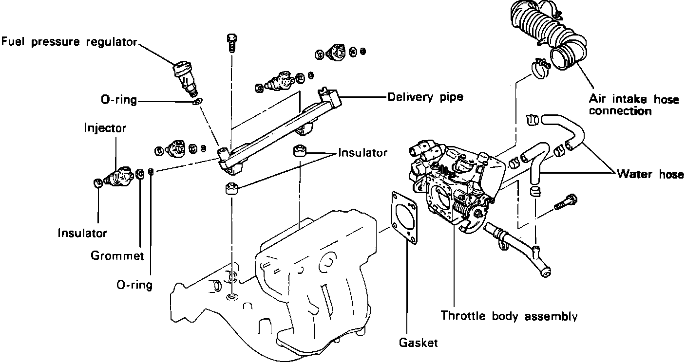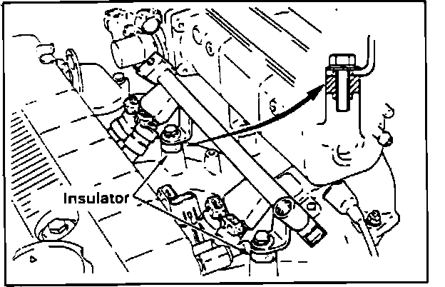6. When installing the fuel rail, check to be sure that the rail insulator is correctly inserted into the installation holes. Tighten the mounting bolts to 7.2 - 9.4 lb.ft (100 - 130 Kg.cm).