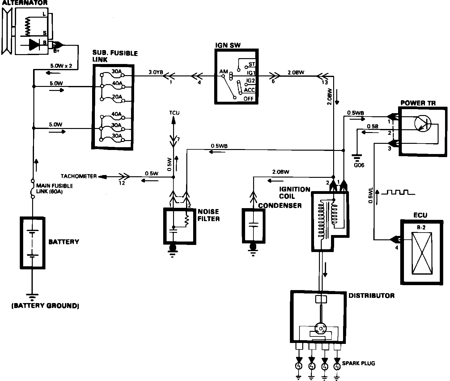 The engine conditions (rpm, load warm-up condition, etc.) are detected by the various sensors. Based upon these sensor signals and the ignition timing standard reference data, signals to interrupt the primary current of the ignition coil are sent to the power transistor. The timing is controlled by the ECU through the power transistor in this manner.