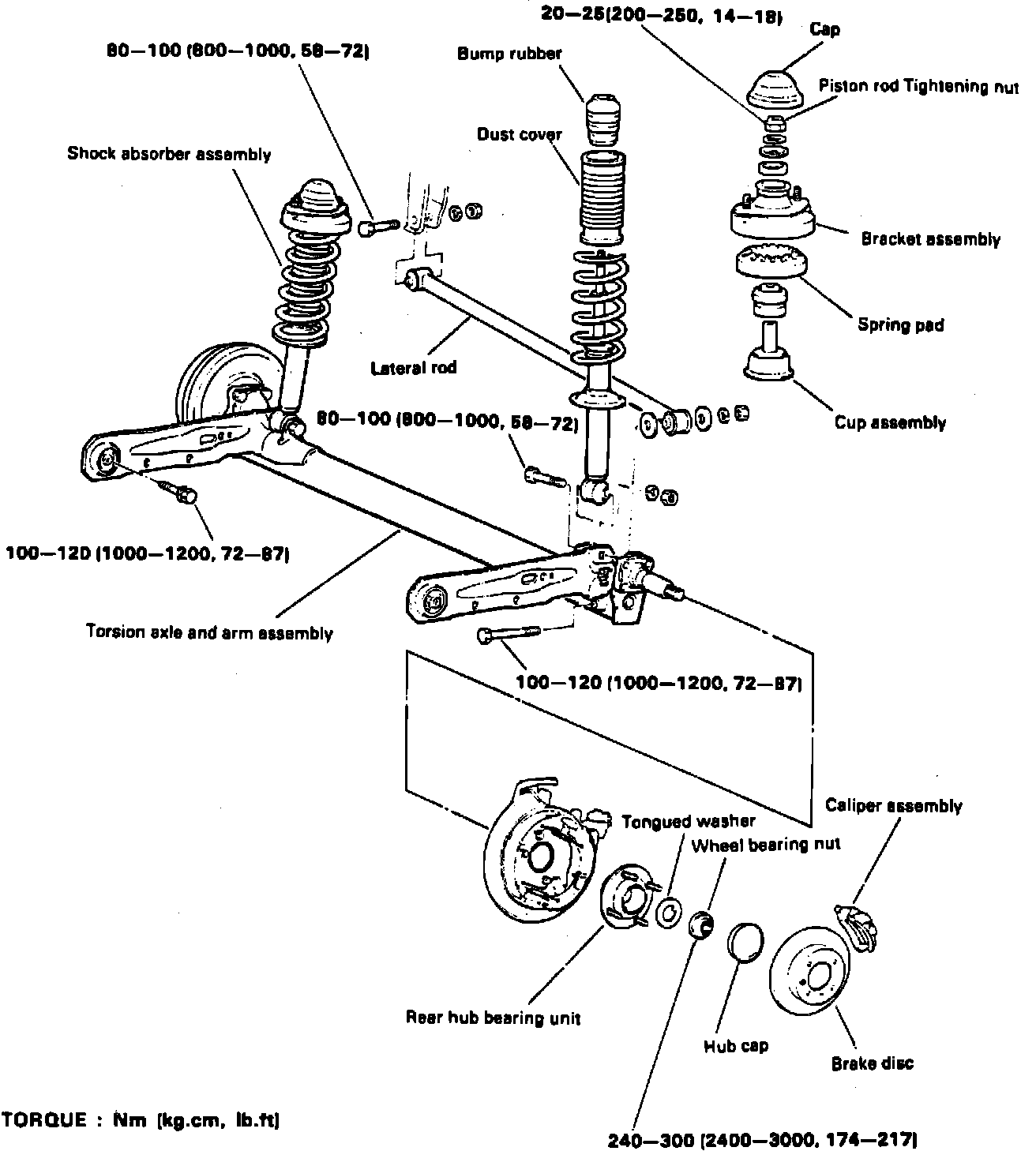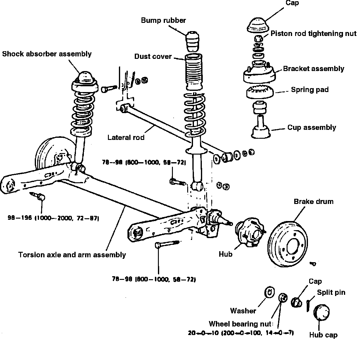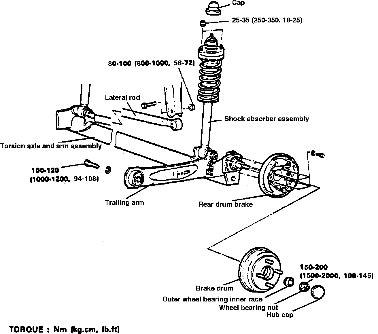 3. Raise torsion axle and arm assembly with a suitable jack, then remove shock absorber mounting nuts and trailing arm mounting bolts.