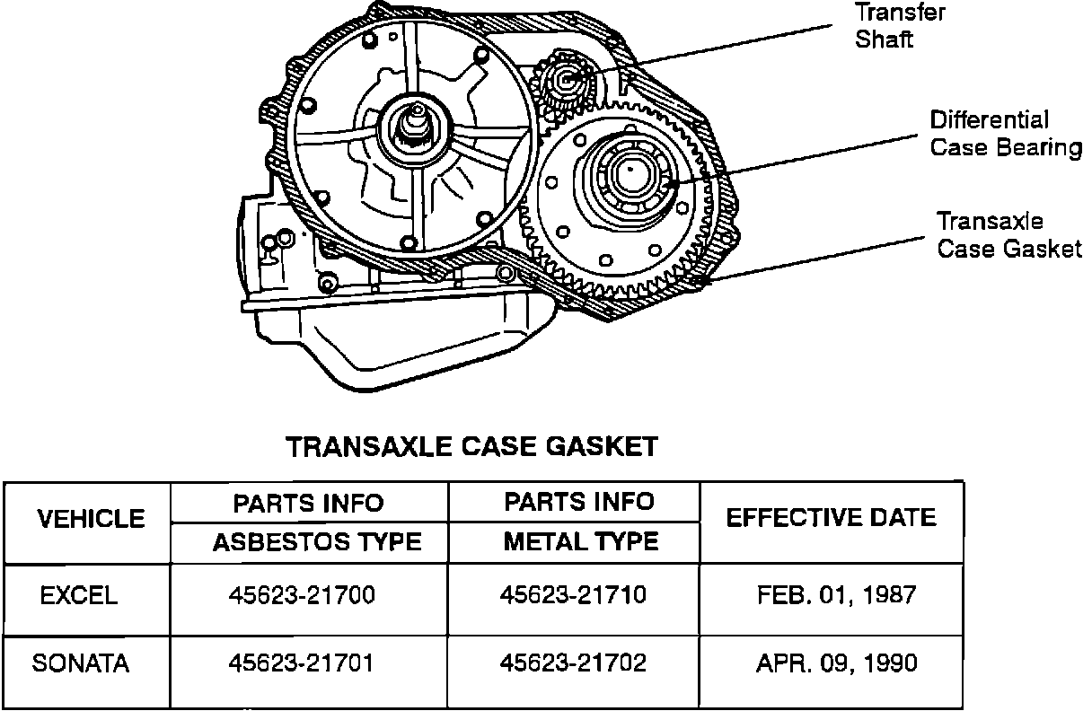 Metal automatic transaxle case gaskets have been used in production for several years. Since, the thickness of the metal and asbestos gaskets is not the same, when replacing an asbestos gasket (installed before the date listed below) with a metal gasket, check the end play of the transfer shaft and the differential case. If the transfer shaft and differential case end play are not within specification, follow the service procedure in this bulletin.