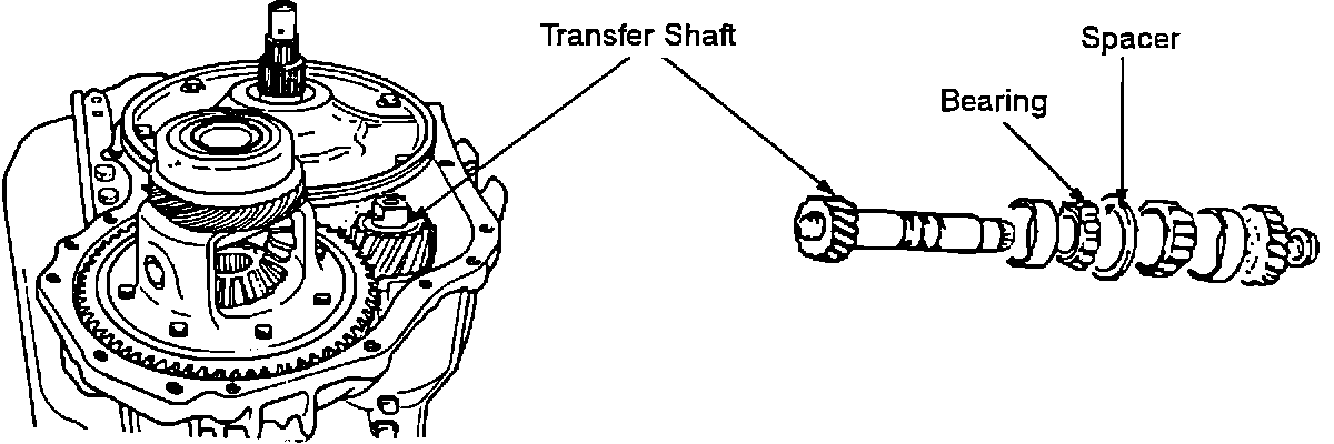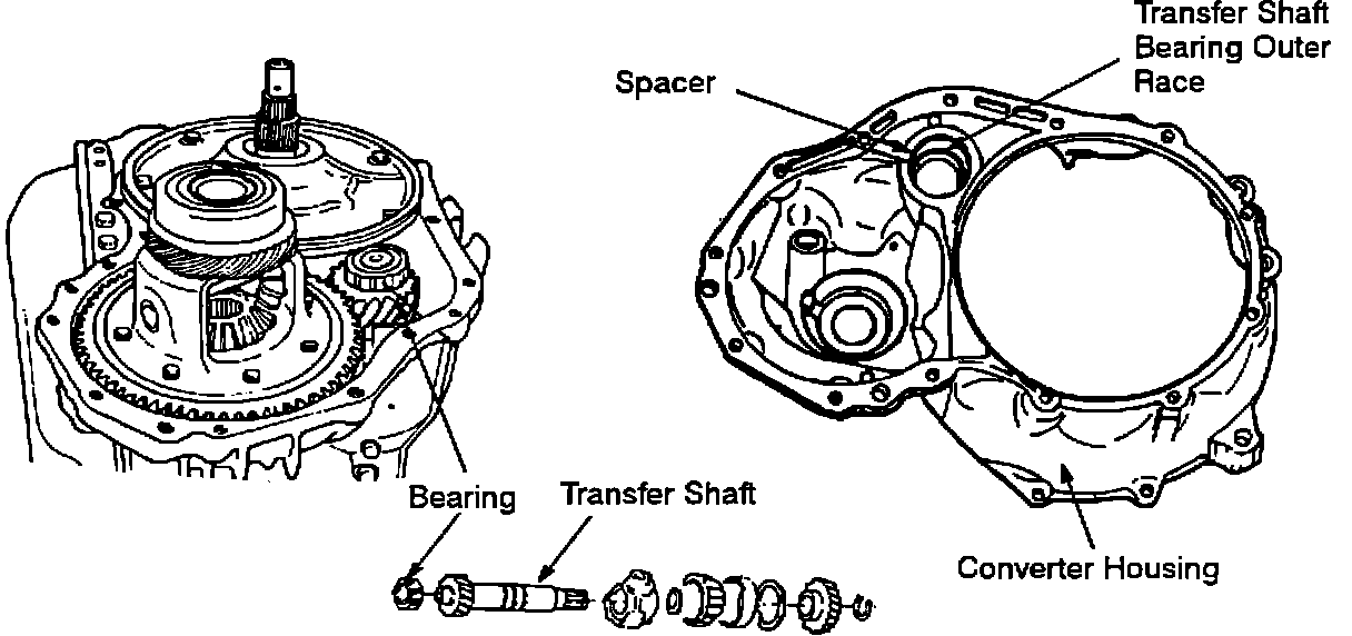 The bearing is installed on the end of the transfer shaft. The end play can be adjusted with the spacer, which is located between the transfer shaft bearing outer race and the converter housing as shown in the illustrations.
