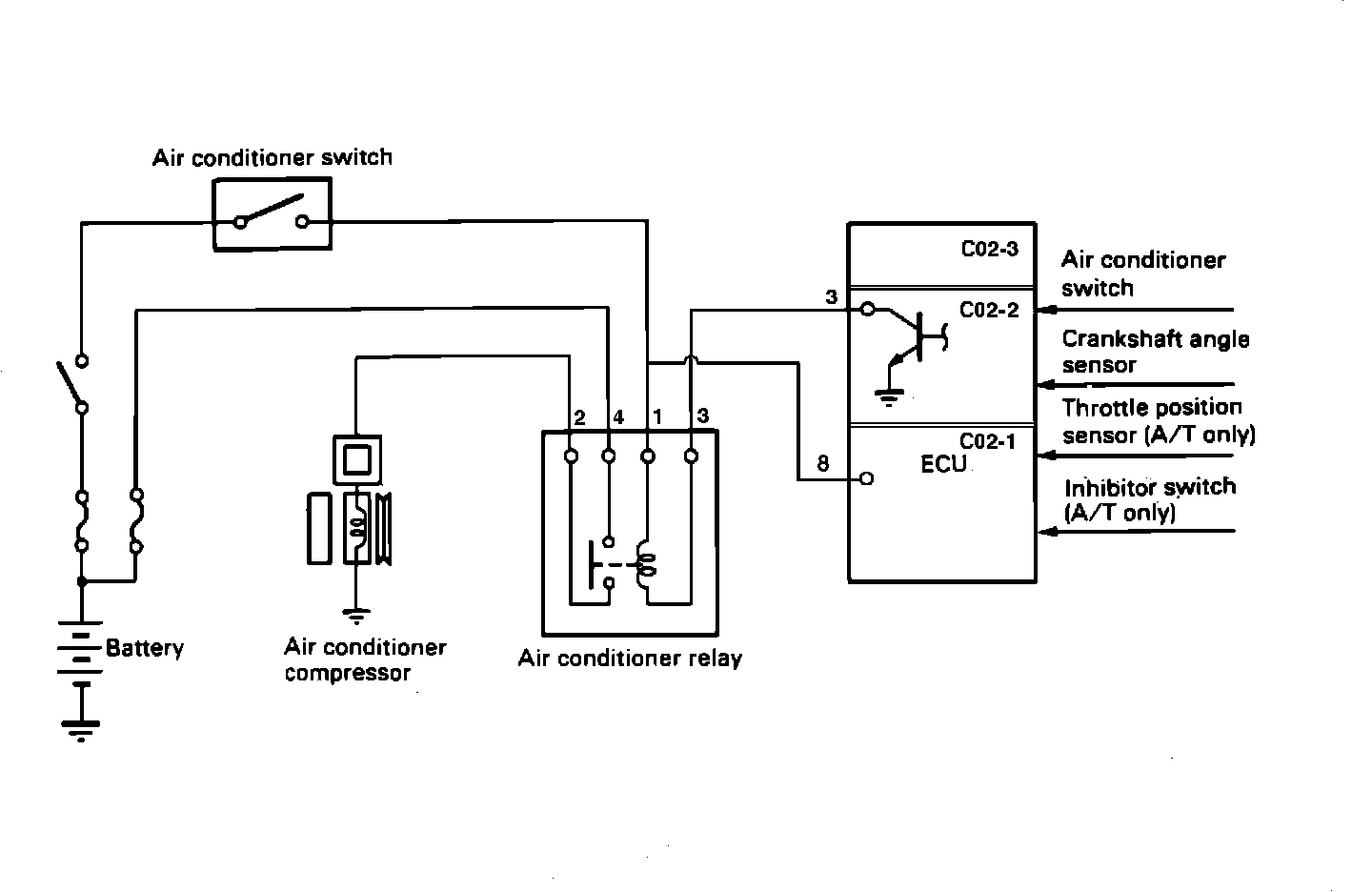 To test the Air Conditioning Signal to the ECU, locate pin #7 of the C02-1 connector on the ECU, and test for the presence of power with the A/C switch in the "on" position. Battery voltage should be available with the switch in the "on" position and 0 volts should be present in the "off" position.