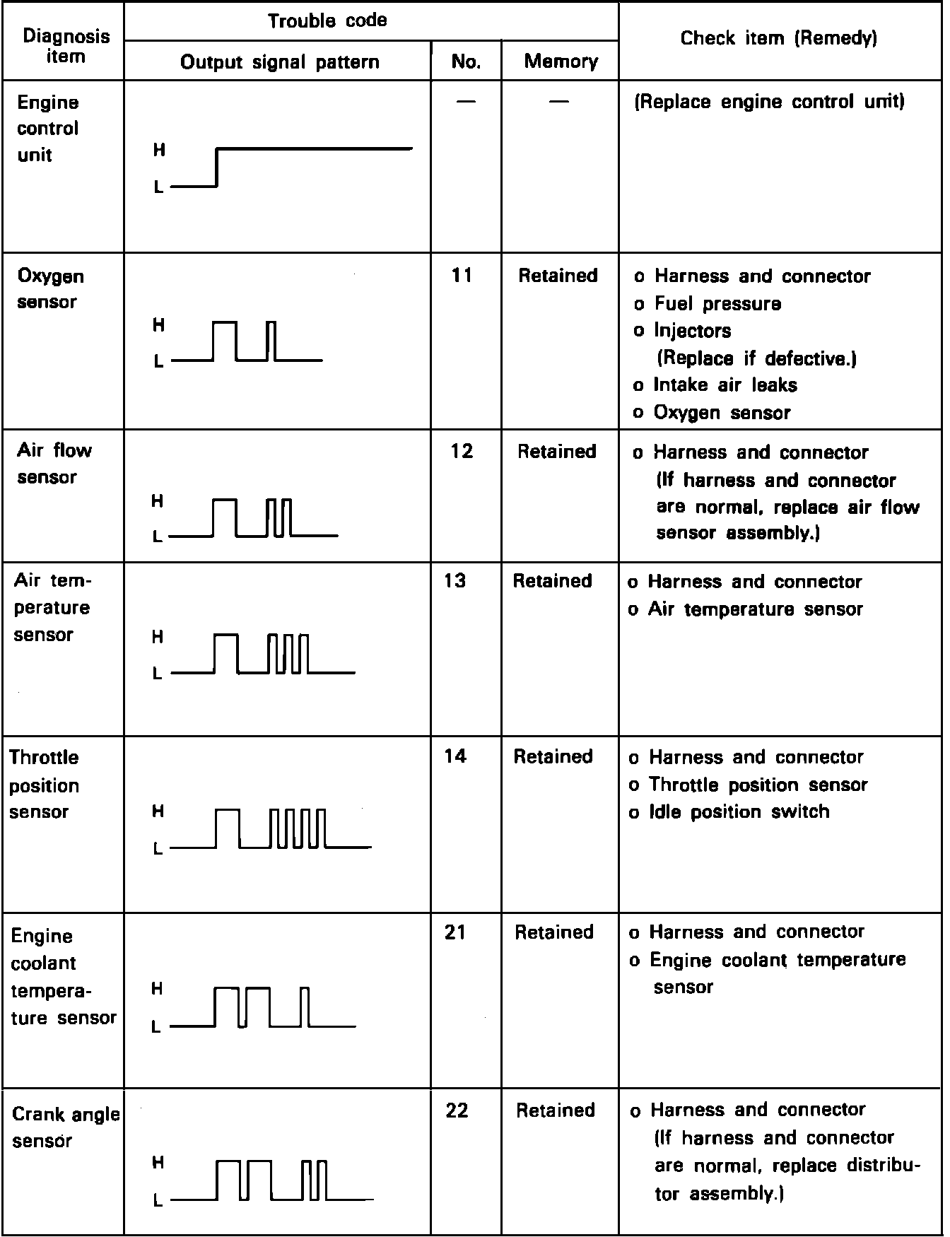 NOTE: There may be more than one error code stored in the ECU memory. If so they will be displayed in ascending order with a 2 second pause between each code. Also, the oxygen sensor code is erased when the ignition is turned off. To test for oxygen sensor codes drive the vehicle a significant distance and check for diagnostic codes before turning the ignition off.