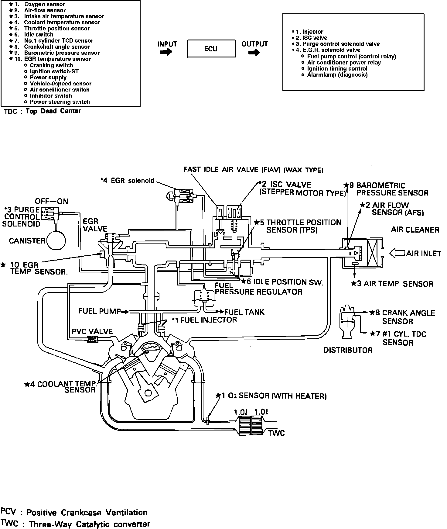 Exhaust gas recirculation, is used to reduce oxides of nitrogen emissions in the vehicle exhaust. EGR uses partial recirculation of the exhaust gases from a port in the cylinder head to a port in the intake manifold. The EGR valve controls the flow of exhaust gas in response to 'E' port vacuum. At partial throttle settings 'E' port vacuum is high and the EGR valve is open. At full throttle and idle 'E' port vacuum is low and the EGR valve remains closed. The ECU, thru the EGR control solenoid valve, prevents EGR operation until the engine reaches operating temperature. The ECU uses the temperature sensor to determine when operating temperature has been reached.