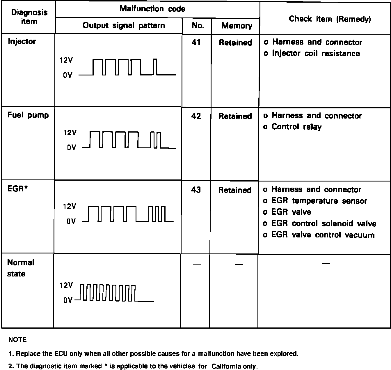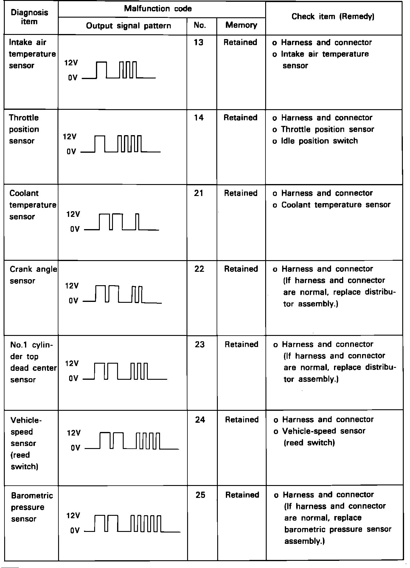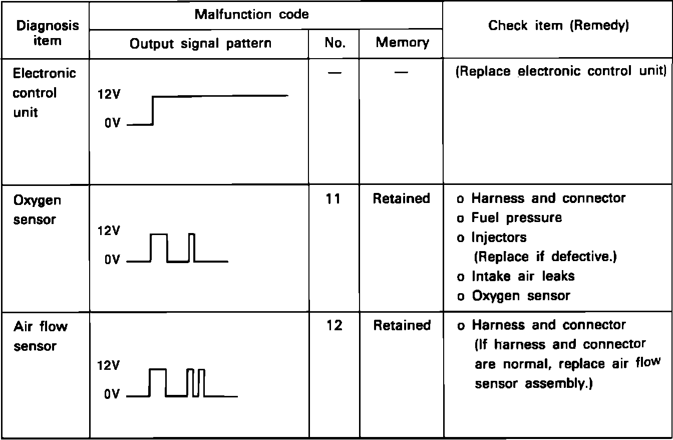 Note: There may be more than one error code stored in the ECU memory. If so they will be displayed in ascending order with a 2 second pause between each code. Also, the oxygen sensor code is erased when the ignition is turned off. To test for oxygen sensor codes drive the vehicle a significant distance and check for diagnostic codes before turning the ignition off.