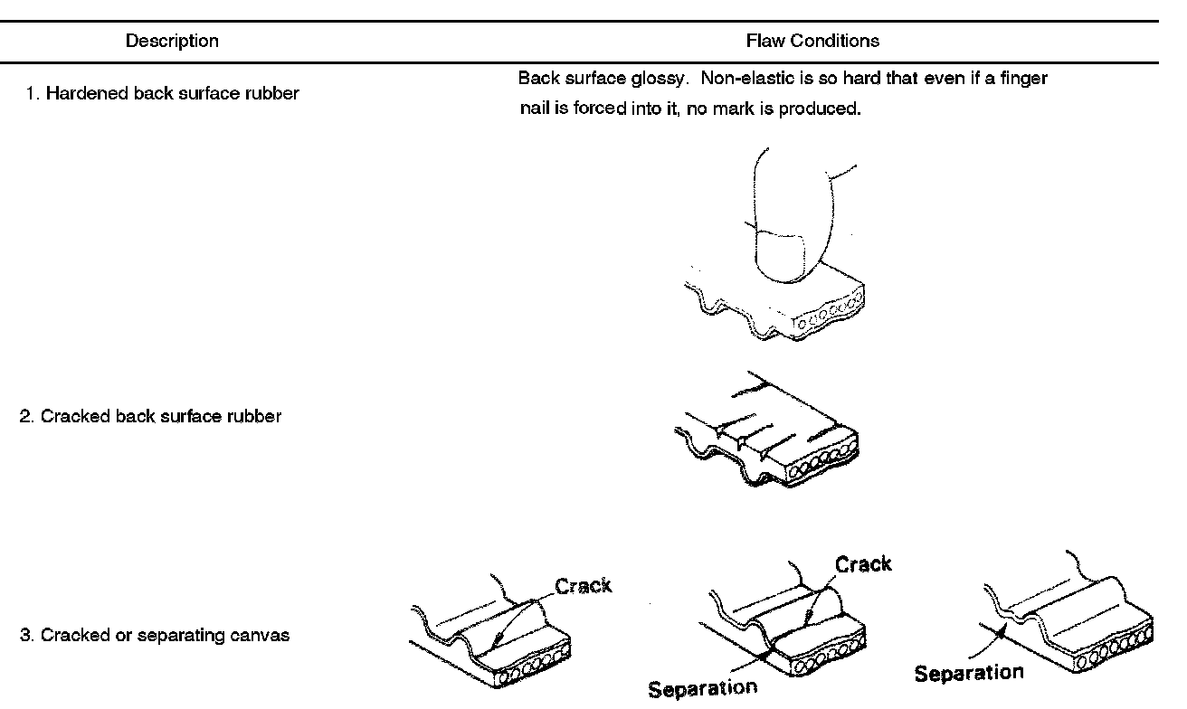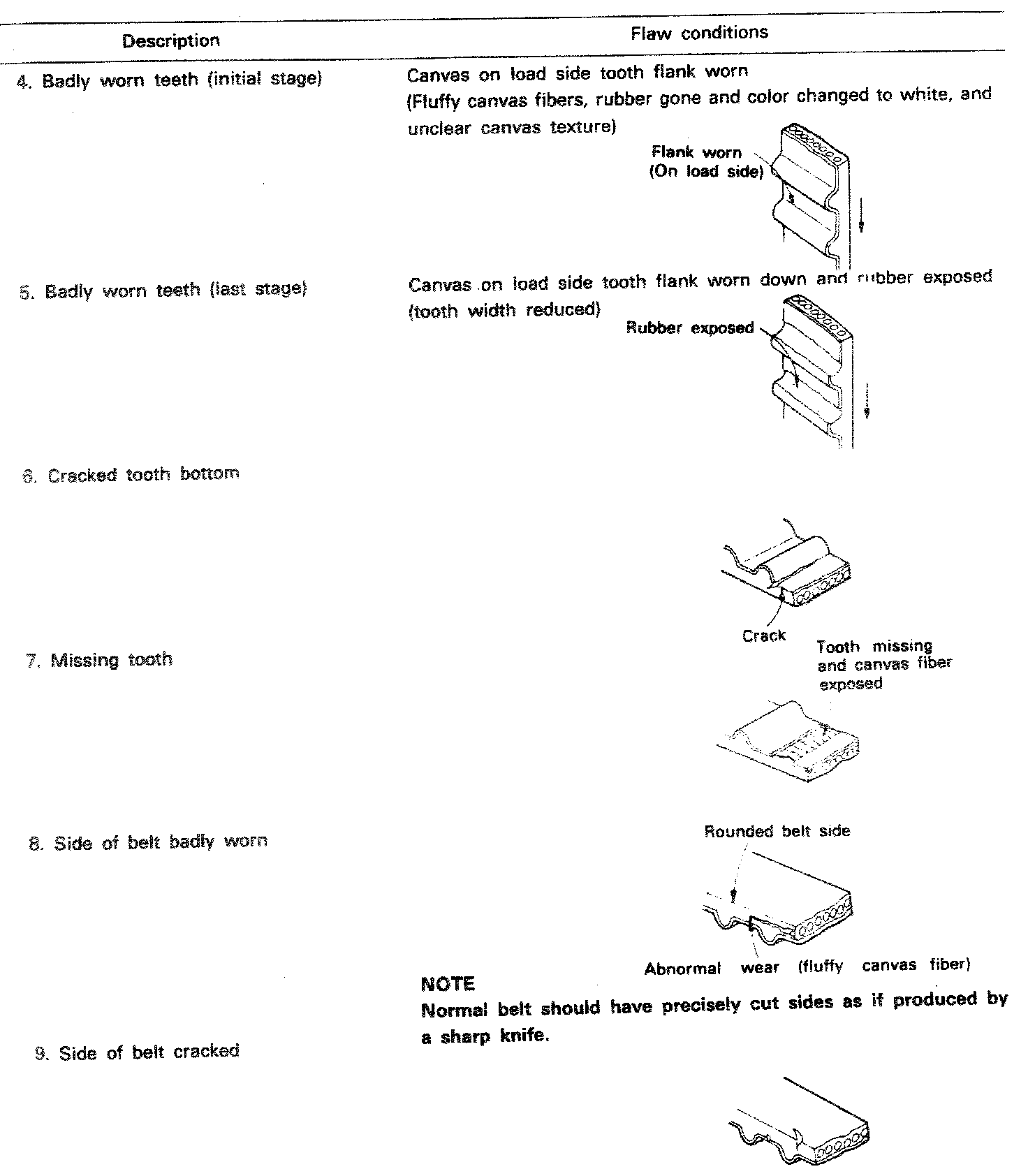 2. When the engine is overhauled or belt tension adjusted, check the belt in detail. If flaws are evident, as shown in images, replace the belt with a new one.