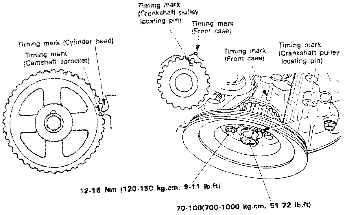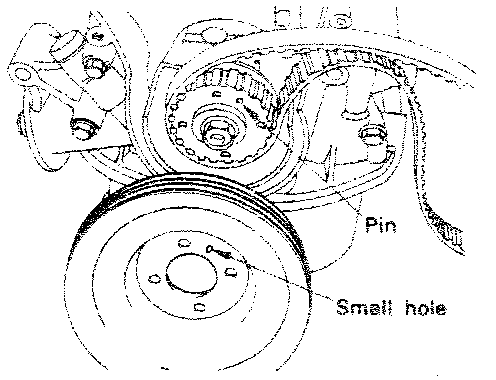 NOTE: In this case, make sure that the crankshaft sprocket pin fits the small hole in the pulley. Tighten the crankshaft pulley bolt to the specified torque. 10 - 12 Nm (100 - 120 kg) (7.2 - 8.7 ft lb).