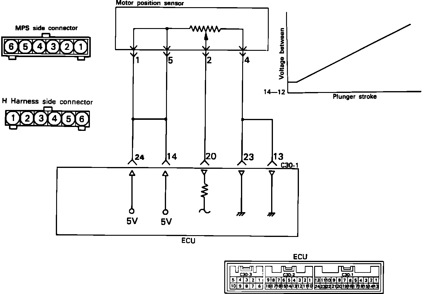 The Motor Position Sensor (MPS) is a variable resistor type sensor, installed in the Idle Speed Control (ISC) servo. Its sliding pin is in contact with the plunger end and as the plunger moves, the internal resistance and output voltage of the MPS changes. The MPS senses ISC servo plunger position and sends the signal to the ECU. The ECU controls the valve opening, and consequently the idle speed by using the MPS signal, idle signal, engine coolant temperature signal, load signals (automatic transaxle and air conditioner) and vehicle speed signal.