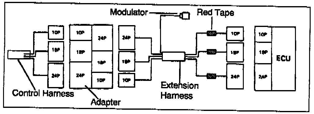 8. Connect the remaining extension harness connectors (the end with the red tape) to the ECU and the control harness connectors to the adapter