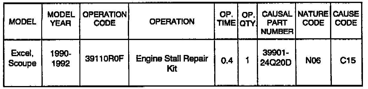 Some 1990 - 1992 Excels and 1991 - 1992 Scoupes with automatic transmissions may stall when the transaxle is shifted into gear immediately after starting a cold engine in ambient air temperatures of 60 - 86° F. A cold start enrichment field fix kit has been designed to correct this condition. This kit does not affect engine performance at any other time.