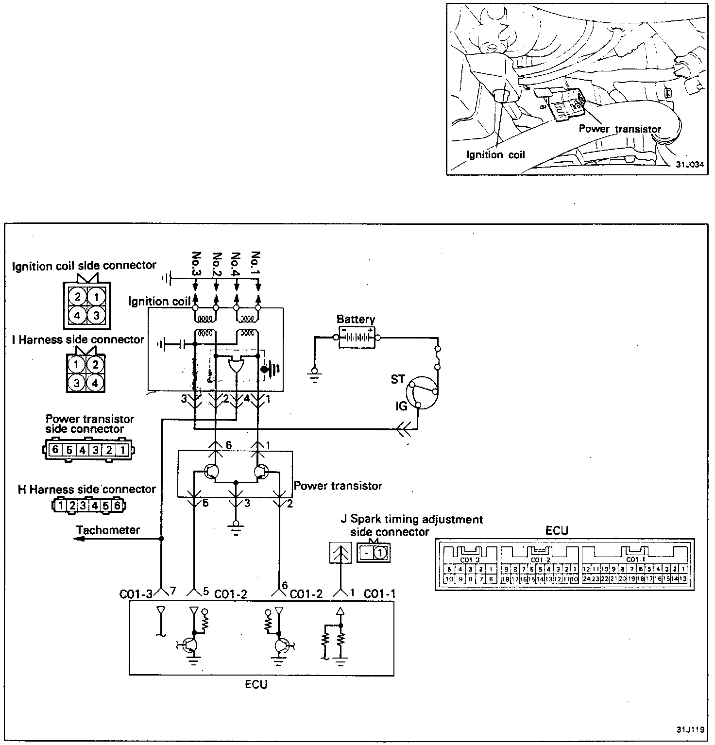 1. Disconnect the ignition coil connector and the transistor connector. Turn the key to the ON position.
