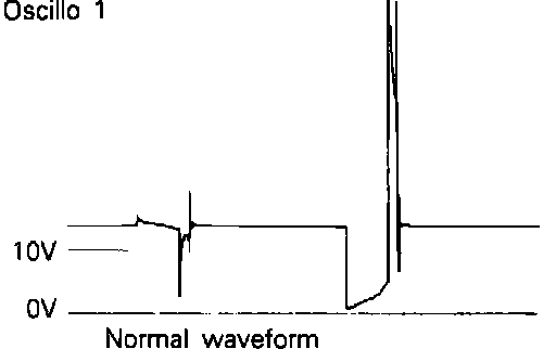 2. Connect the scope probe to transistor harness terminal connector 1 (shown in the system schematic diagram) and compare the signal to the pattern shown.