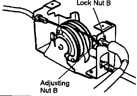 4. THROTTLE CABLE ADJUSTMENT Loosen lock nut B sufficiently to allow cable adjustment. Turn adjusting nut B until the throttle lever stopper begins to move away from the idle position switch. Then, turn adjusting nut B in the opposite direction approximately 1 turn. The throttle cable play (inner cable) should be 2-3 mm (.08-.12 in). Tighten lock nut B and verify cable play. Visually verify that the throttle lever stopper completely depresses the idle switch plunger.