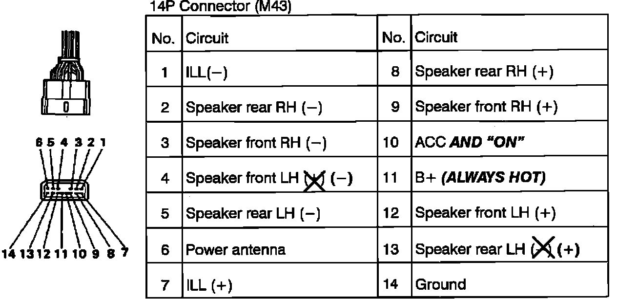 The correct circuit functions of the 14 pin audio connector (M43) for the base/medium grade audio are shown.