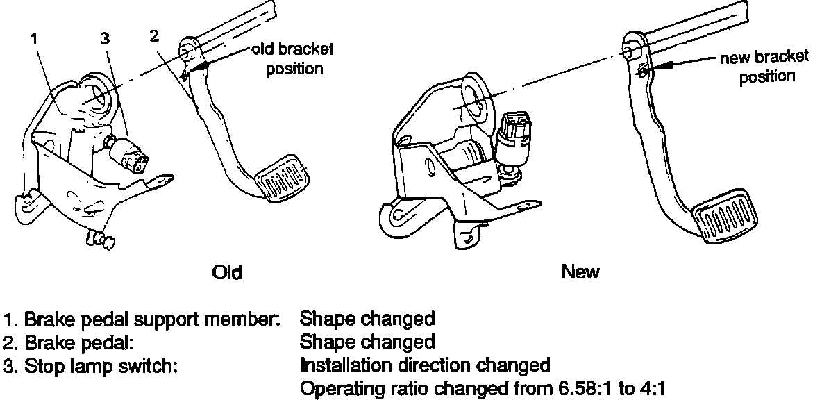 The brake pedal support member and the brake pedal have been changed in automatic transaxle equipped vehicles to improve serviceability and to change the position of the stop lamp switch.