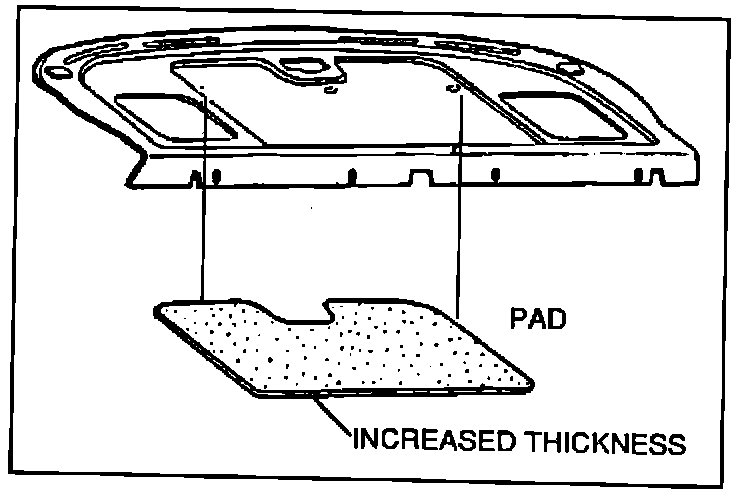 2. Apply stops of "camper shell tape"* or an equivalent adhesive backed closed cell foam tape to cover the high spots of the metal shelf panel support. Make sure the center high mounted lamps and speaker wires have sufficient foam around them.