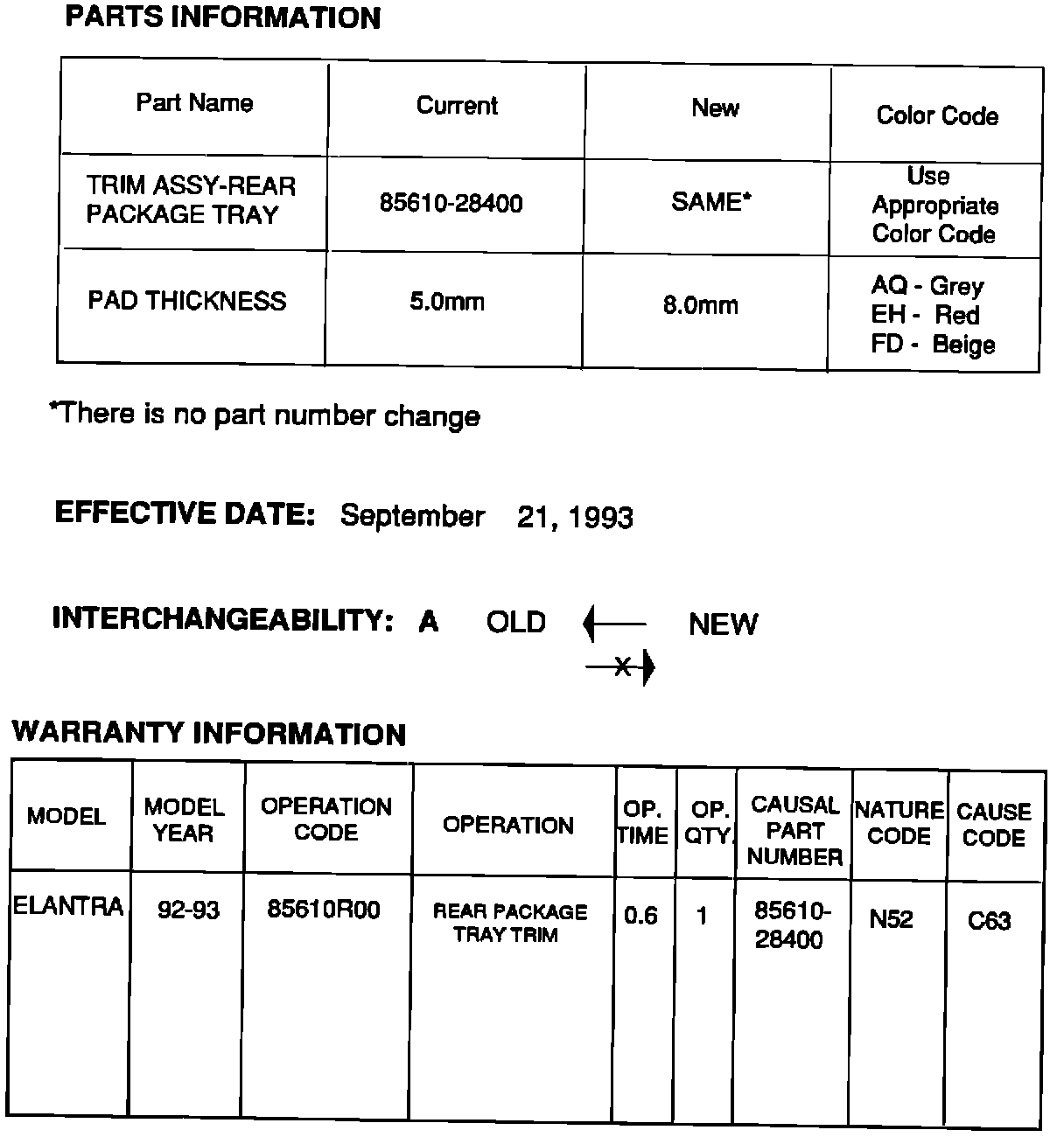 Elantra vehicles produced prior to September 21, 1993, may squeak and rattle when driving over rough roads due to the package tray trim vibrating against the metal shelf panel support below it. Vehicles produced after September 21, 1993 have thicker foam to prevent this condition.