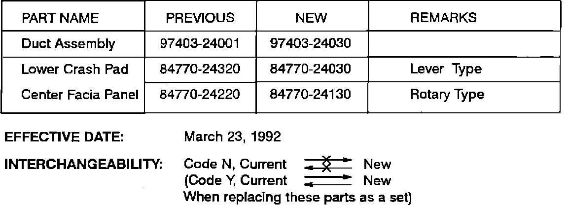 The center air vent duct assembly and lower crash pad center facia panel were modified to simplify the use of the air vent knobs.