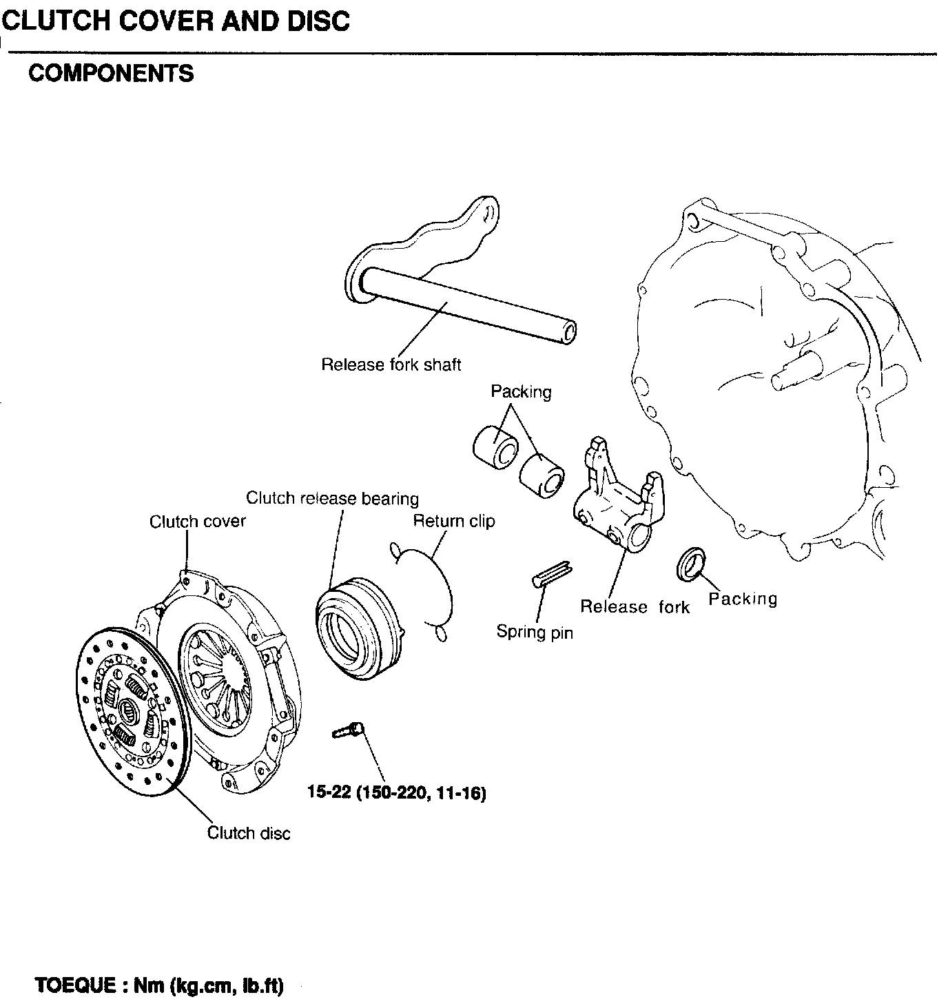 8. Remove the clutch release shaft, packings, return spring and release fork.