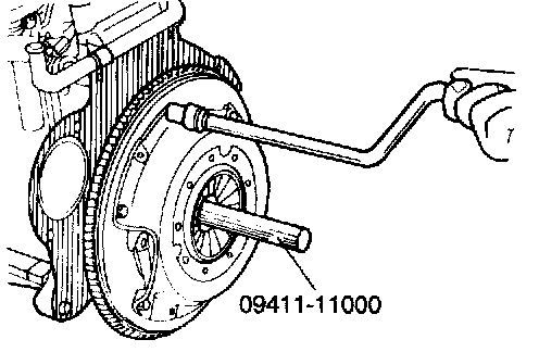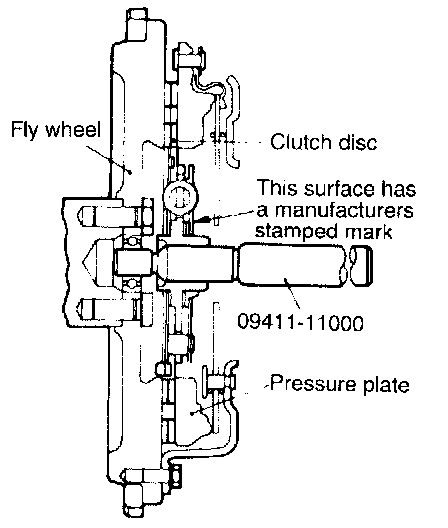 7. Using the special tool (09411-11000), install clutch disc to flywheel. When installing the clutch disc, be sure that the surface having the manufacturers stamp is towards the pressure plate side.