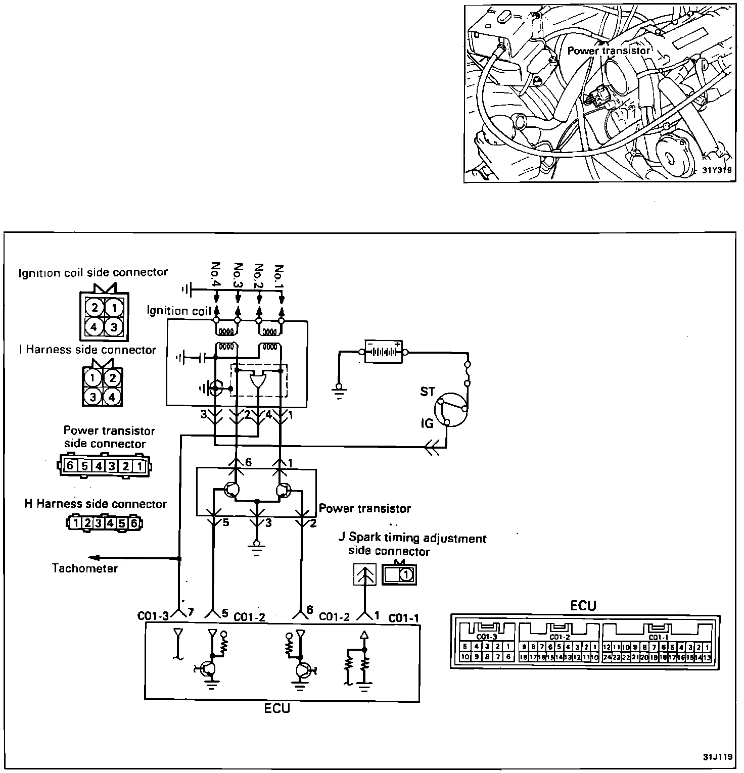 1. Measure the resistance between connector terminals 4 and 2 (the coils at the number 1 and number 4 cylinder sides) of the ignition coil. and between terminals 4 and 1 (the coils of the number 2 and number 3 cylinder sides).