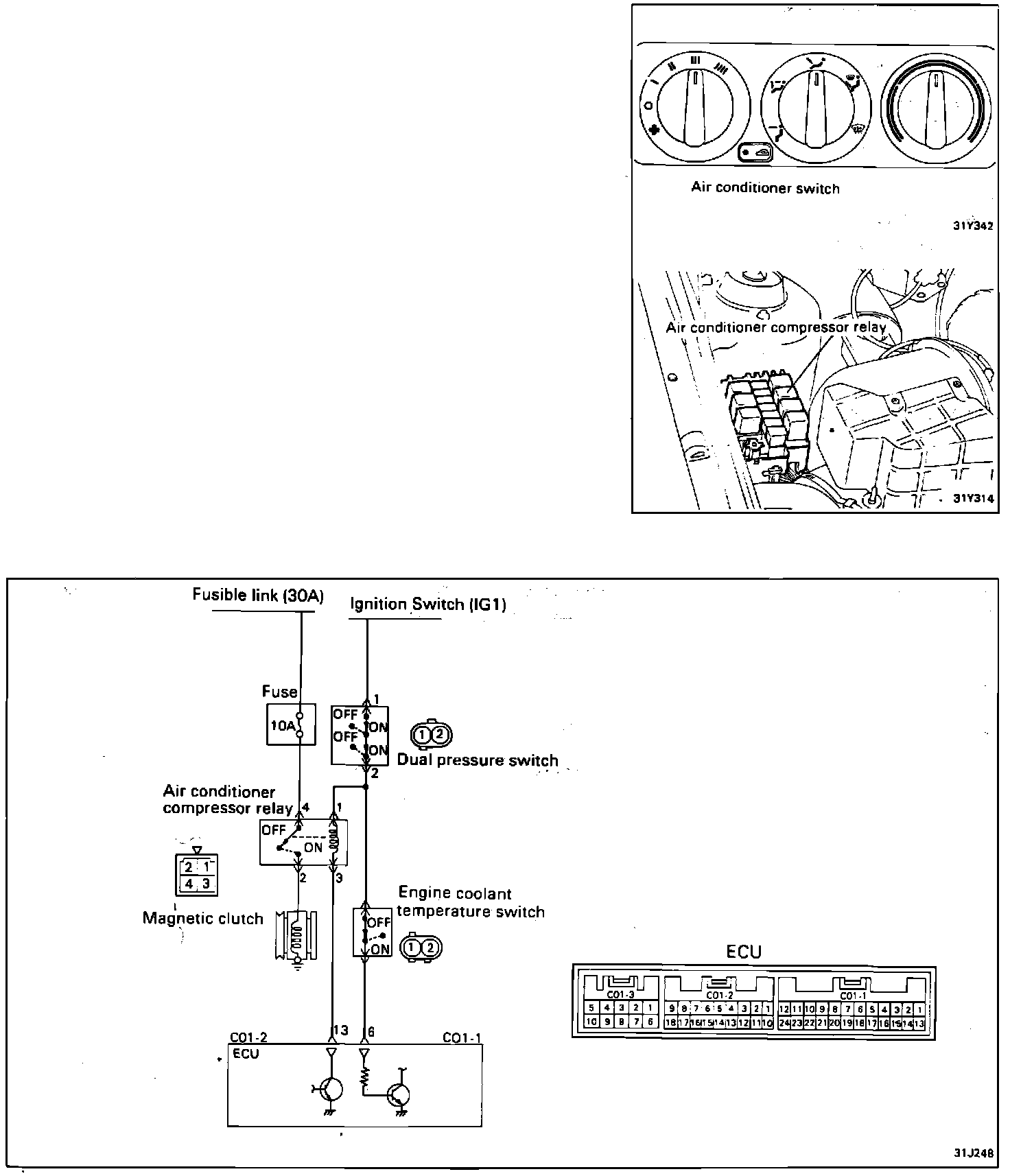 2. Turn the key, A/C and blower switches to the ON position and check for voltage at harness terminal 1 of the A/C relay.