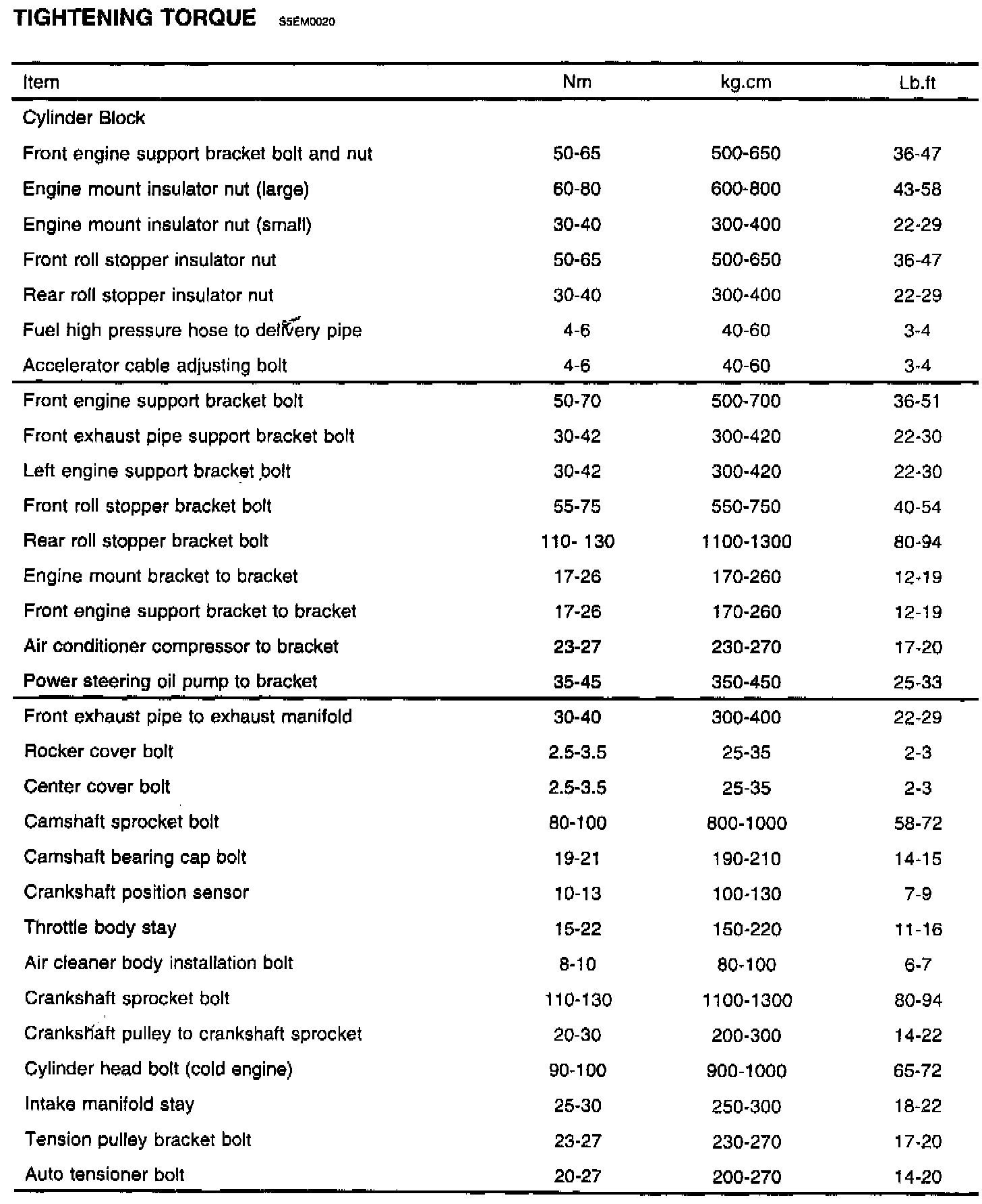 Tightening Torque Specifications