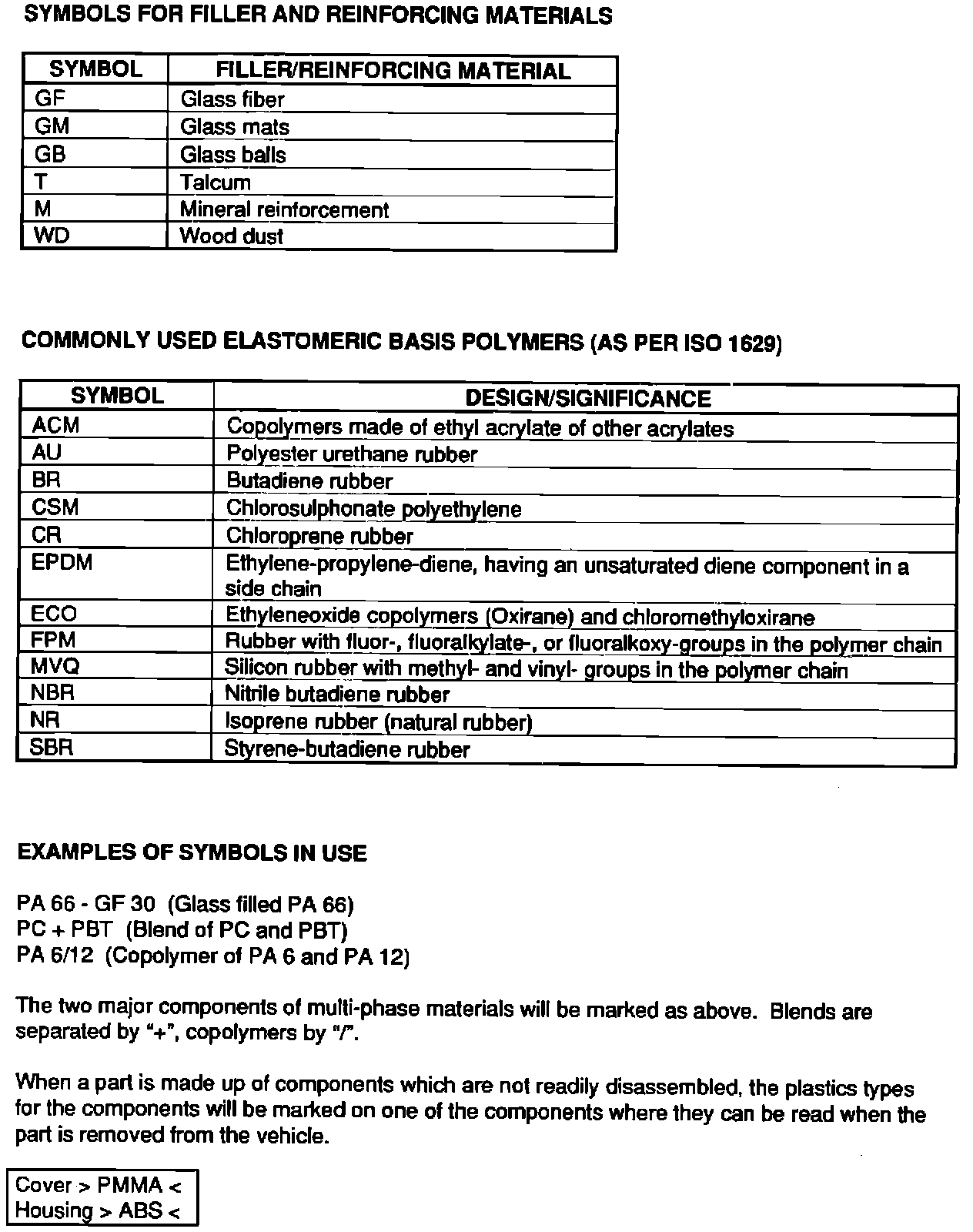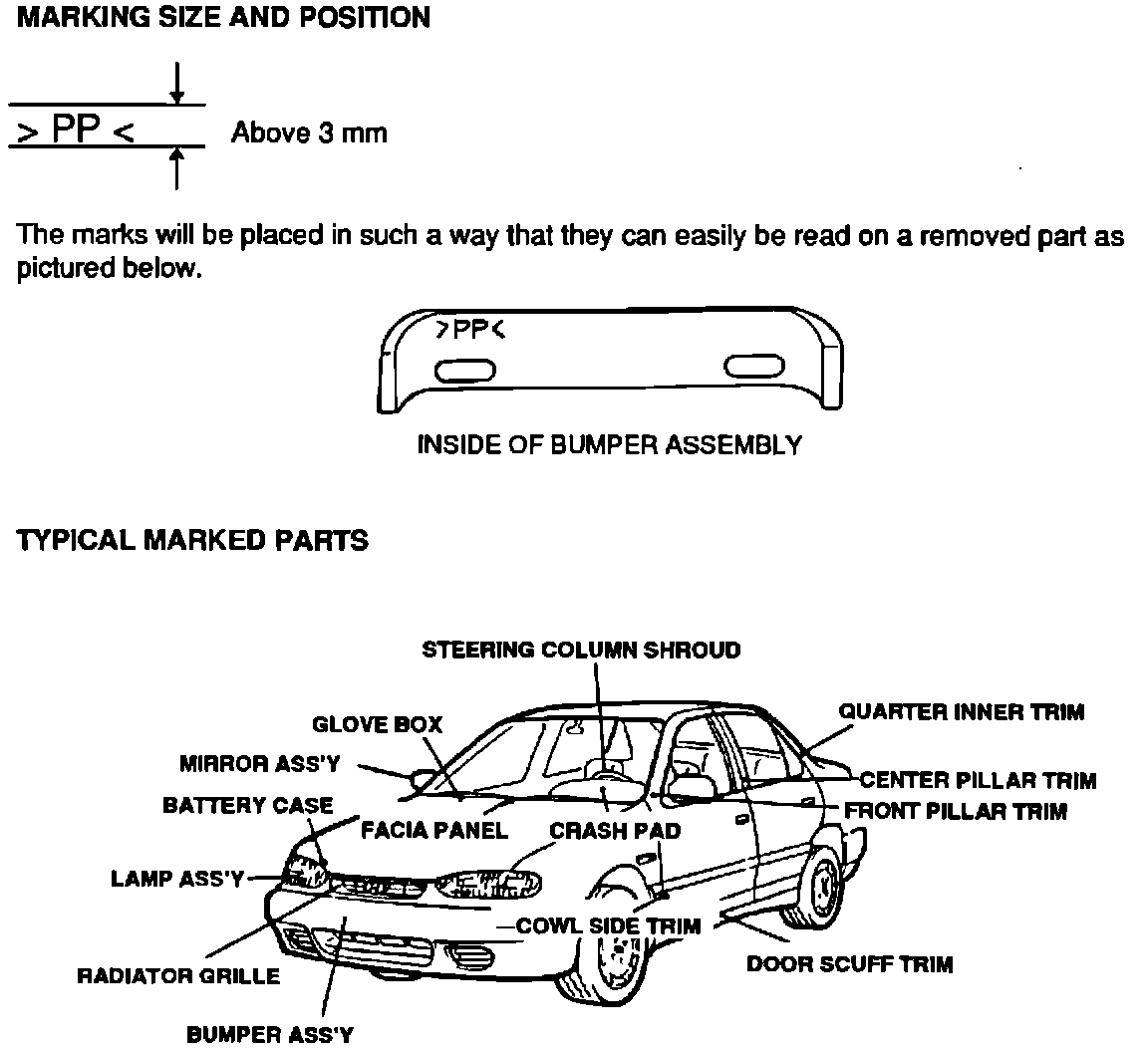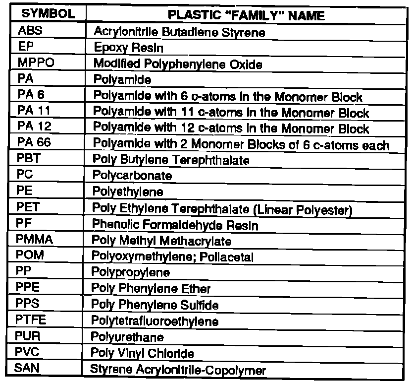 Other symbols will be used as new plastics are developed. Most paint suppliers can identify unknown symbols. If trouble is encountered with an unknown symbol, contact your Hyundai Field Technical Representative, who can obtain and provide the plastic "FAMILY" name, as well as make sure the new symbol is included in future revisions of this TSB.