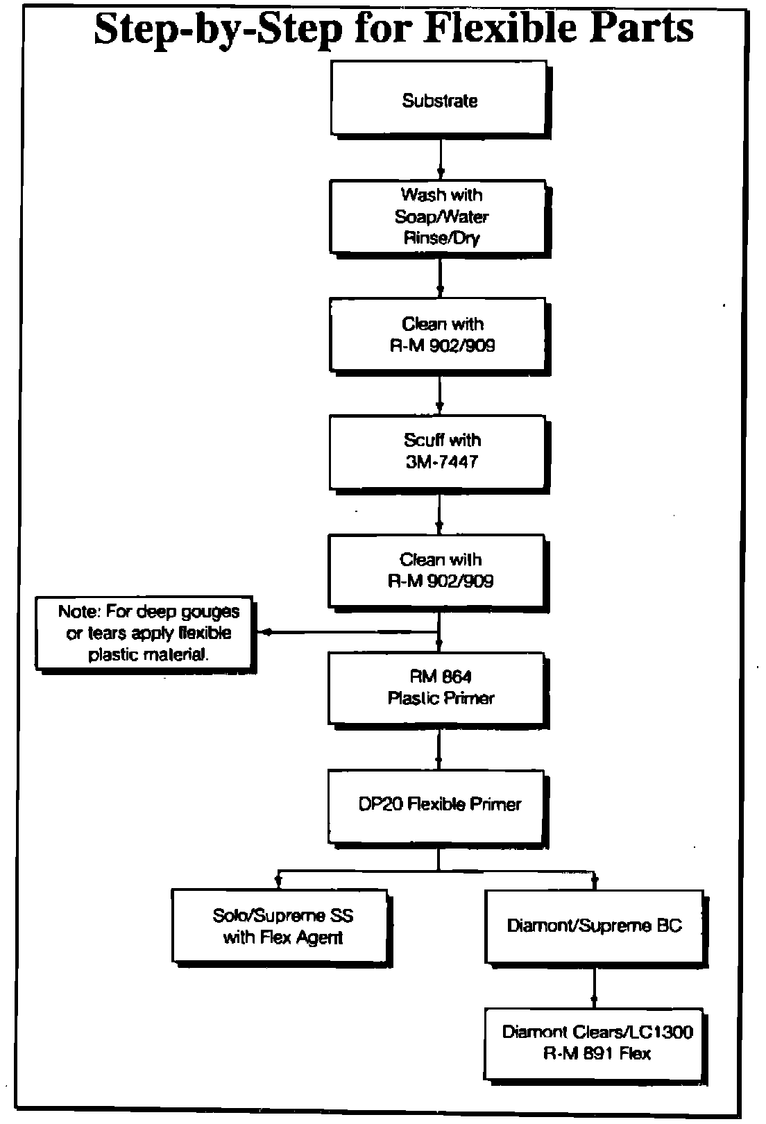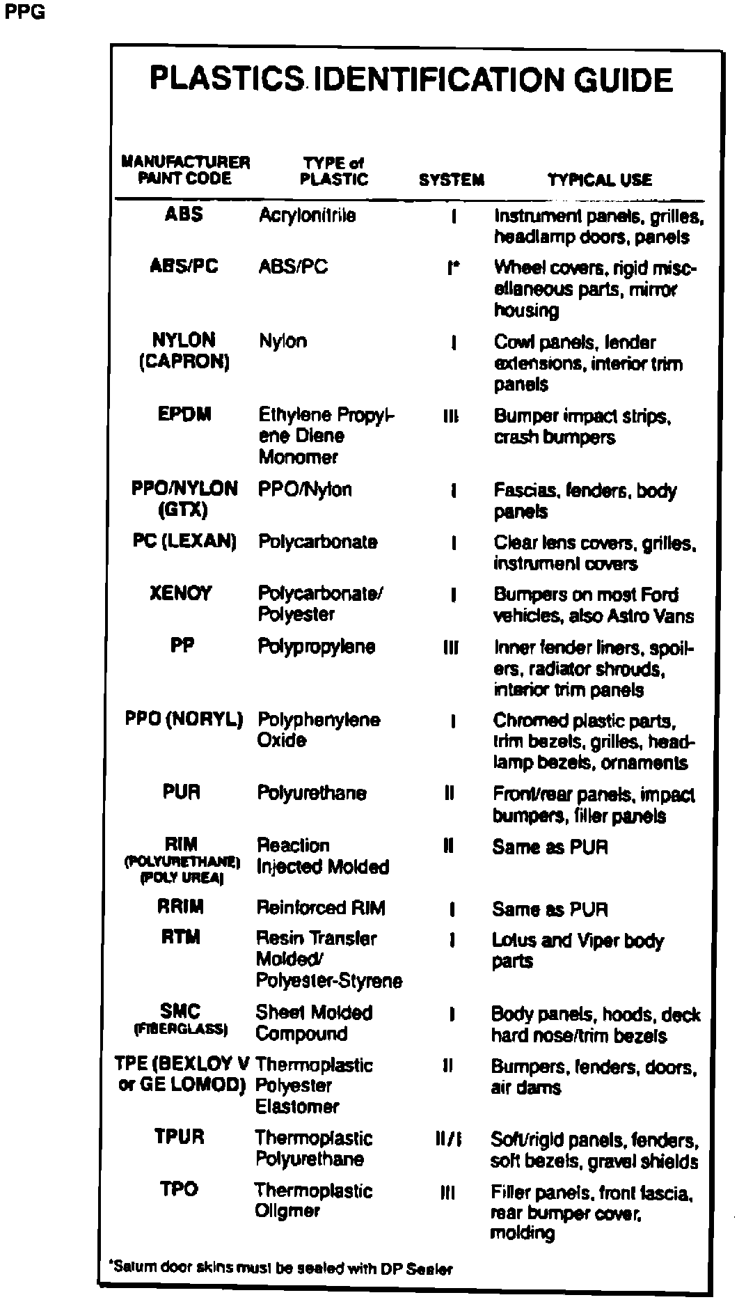 The plastic part identification symbols can be used in conjunction with a plastic painting procedure to properly paint plastic parts. Use the correct procedure for the brand of paint to be applied. Excerpts from the PPG and BASF procedures are shown as examples. See your paint jobber for the correct procedures.