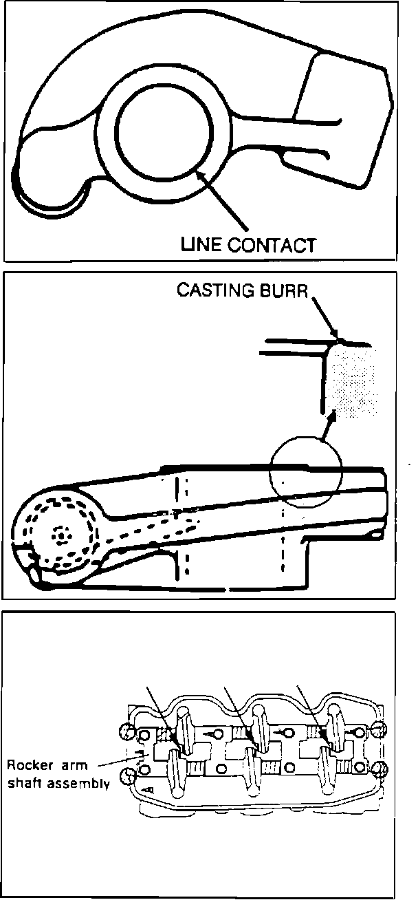 A small casting burr may have been left on the side face of the rocker arm and may not allow a full face contact between the rocker arm and the bearing tower.