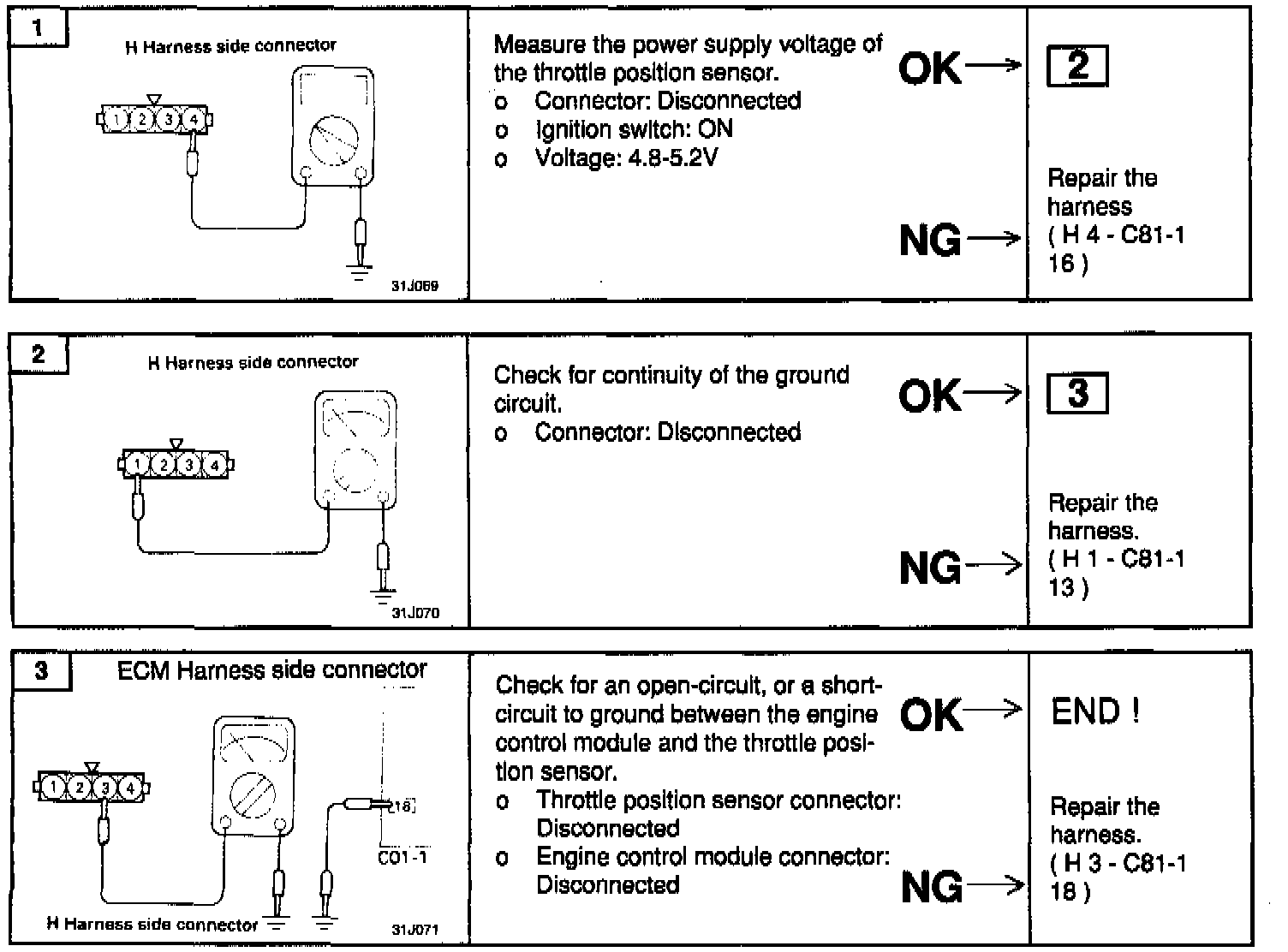 5. If the resistance is out of specification. or fails to change smoothly, replace the [1][2]throttle position sensor.