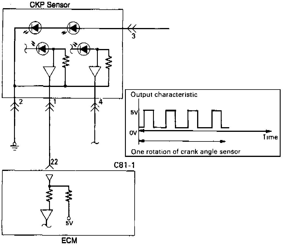 The crankshaft position sensor senses the crank angle (piston position) of each cylinder, converts it into a pulse signal. - The engine control module computes the engine speed and controls the fuel injection timing and ignition timing based on the input signal.