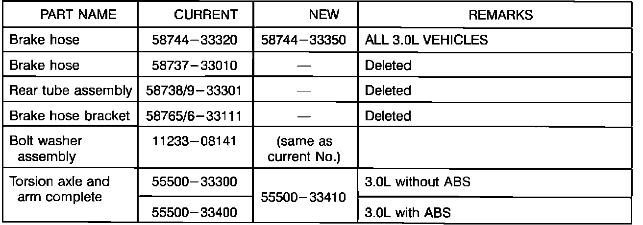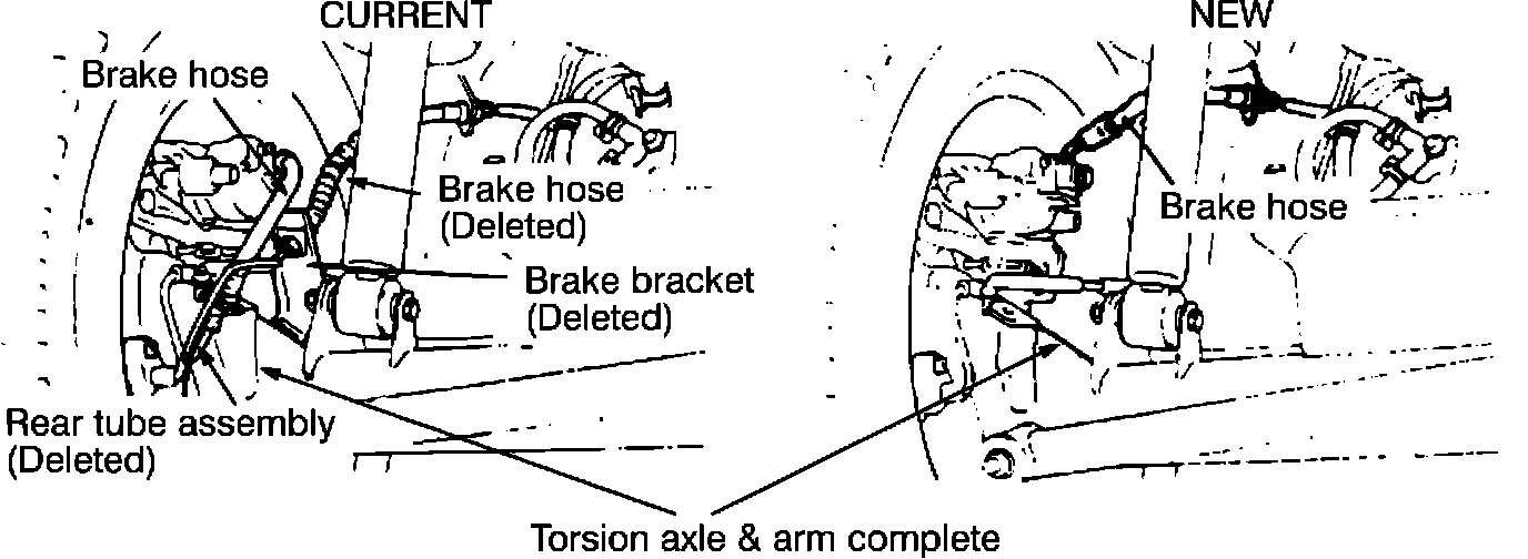 The rear disc brake hoses have been changed to a one piece hose in order to improve efficiency. In addition, the torsion axle and arm complete have been changed for ease of service.