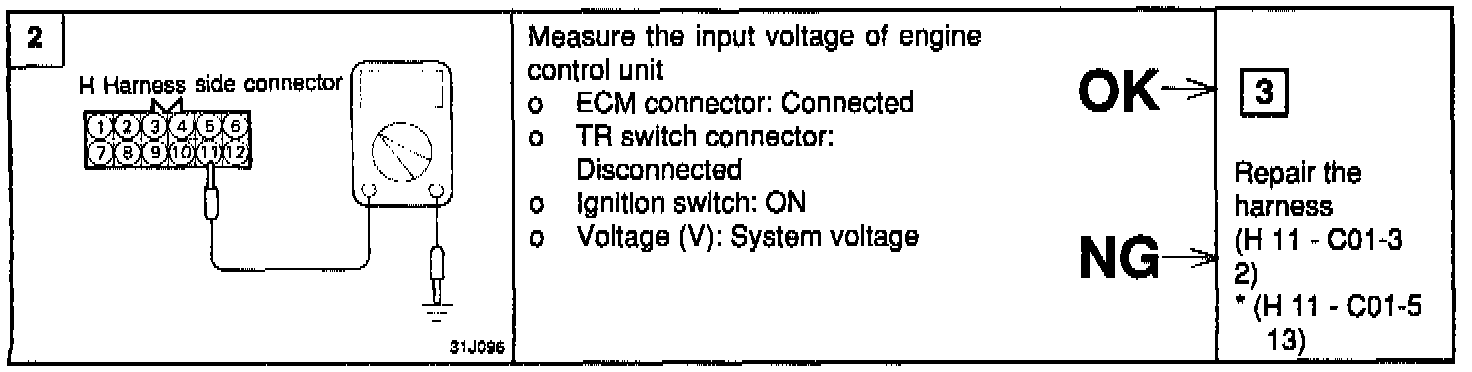 When the ignition switch is in the ST position, the battery voltage is applied through the ignition switch and transaxle range switch to the engine control module.